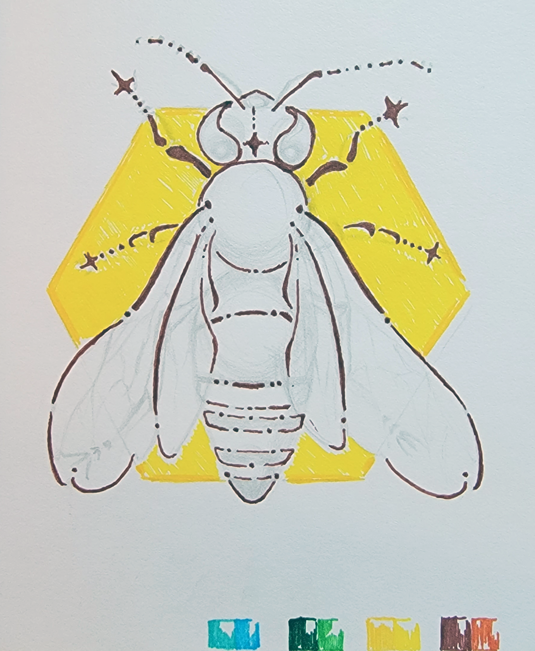 After the preliminary sketches and discovering the colours that are most easily perceived, but the two I discovered as easily absorbed were both on the same tonal level, so I adjusted the colours to better pair with each-other. As well as adding a golden honey colour and a warm brown.