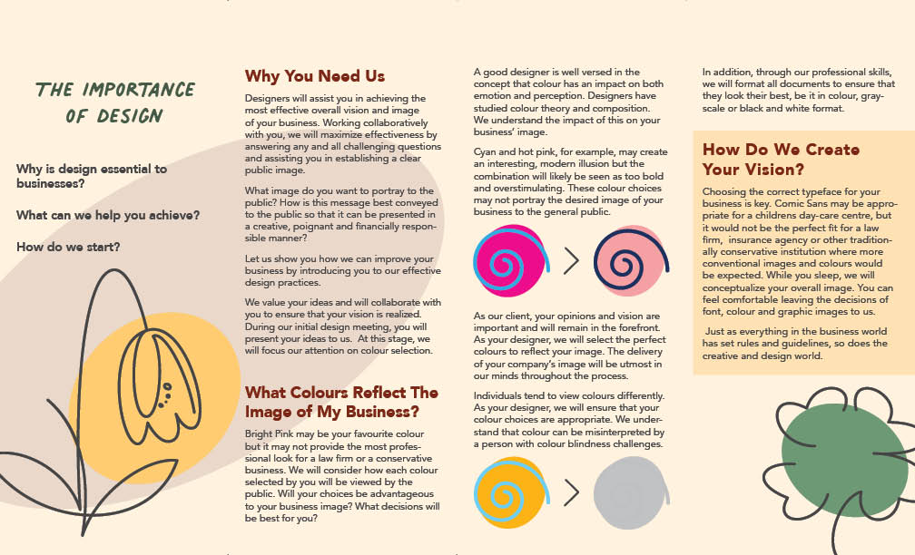Within the pamphlet it explains why we might change the design from what you have intended and show you how people may view your design. This includes touching on colourblindness and black and white printers, things most people don't think about.